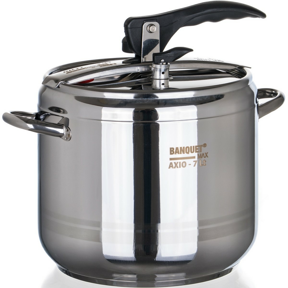 Nerezový tlakový hrnec AXIO od značky Banquet o objemu 7 l je určený pro rychlou a efektivní přípravu jídel, při které potraviny neztrácejí chuť ani živiny. Kombinace celonerezového provedení, pevné konstrukce a kvalitního zpracování vytváří odolný kuchyňský pomocník, který obstojí při každodenním vaření. Moderní pákový uzávěr zajišťuje pohodlné používání a přispívá k bezpečnému provozu.Víko je vybaveno třemi bezpečnostními ventily – pracovním, bezpečnostním a silikonovým pod přítlačnou sponou. Tato trojitá ochrana brání nechtěnému otevření během vaření a zajišťuje plně kontrolovaný provoz. Silnostěnné provedení asendvičové dno udržují rovnoměrnou distribuci tepla, takže se pokrmy připravují rychleji a úsporně.Tlakový hrnec je vhodný na všechny běžné typy varných desek včetně indukce. Robustní nerezová konstrukce umožňuje všestranné použití a dlouhou životnost, zároveň se pohodlně drží díky nerezovým madlům. Hrnec oceníte při přípravě polévek, luštěnin, masových jídel i omáček.Hlavní výhody produktu